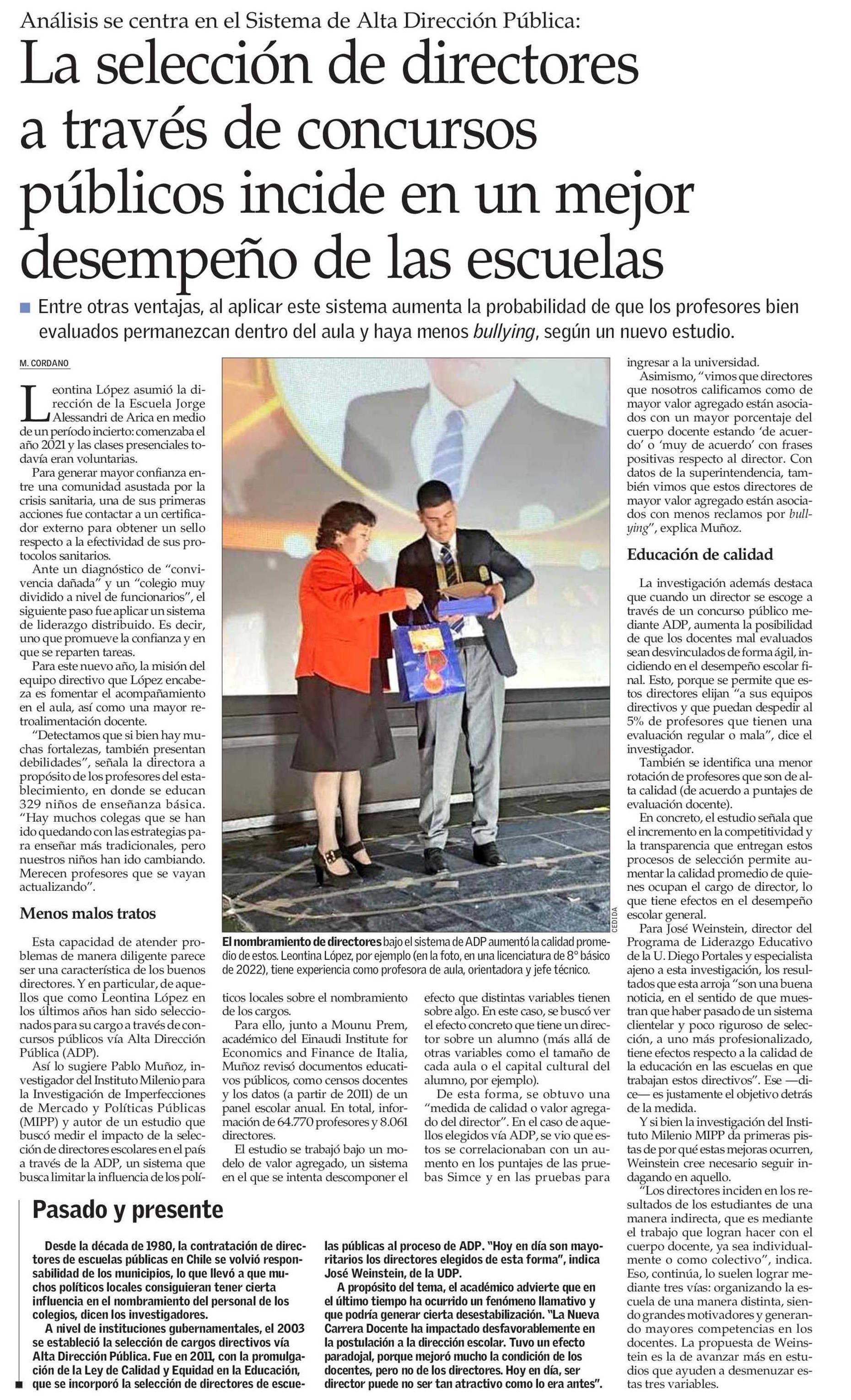 “(Los resultados de un estudio sobre la selección de directores escolares en el país) son una buena noticia, en el sentido de que muestran que haber pasado de un sistema clientelar y poco riguroso de selección, a uno más profesionalizado, tiene efectos respecto a la calidad de la educación en las escuelas en que trabajan estos directivos”.